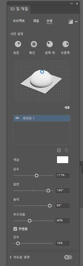 심도 50, X-50 Y-30 Z-20 , 조명 강도- 117 회전-145 높이-85 부드러움 40 주변광 강도 16에 맞춰줍니다.