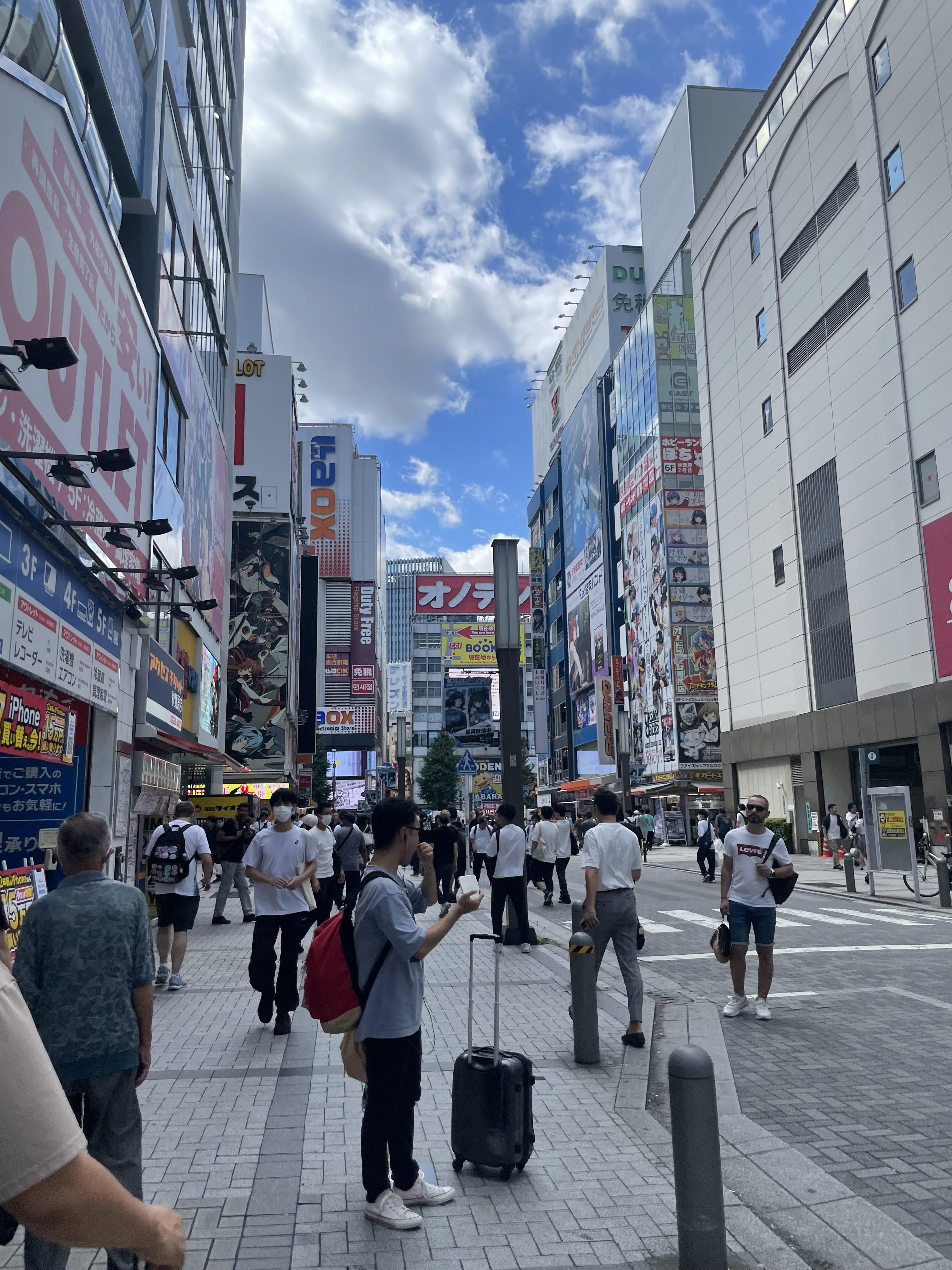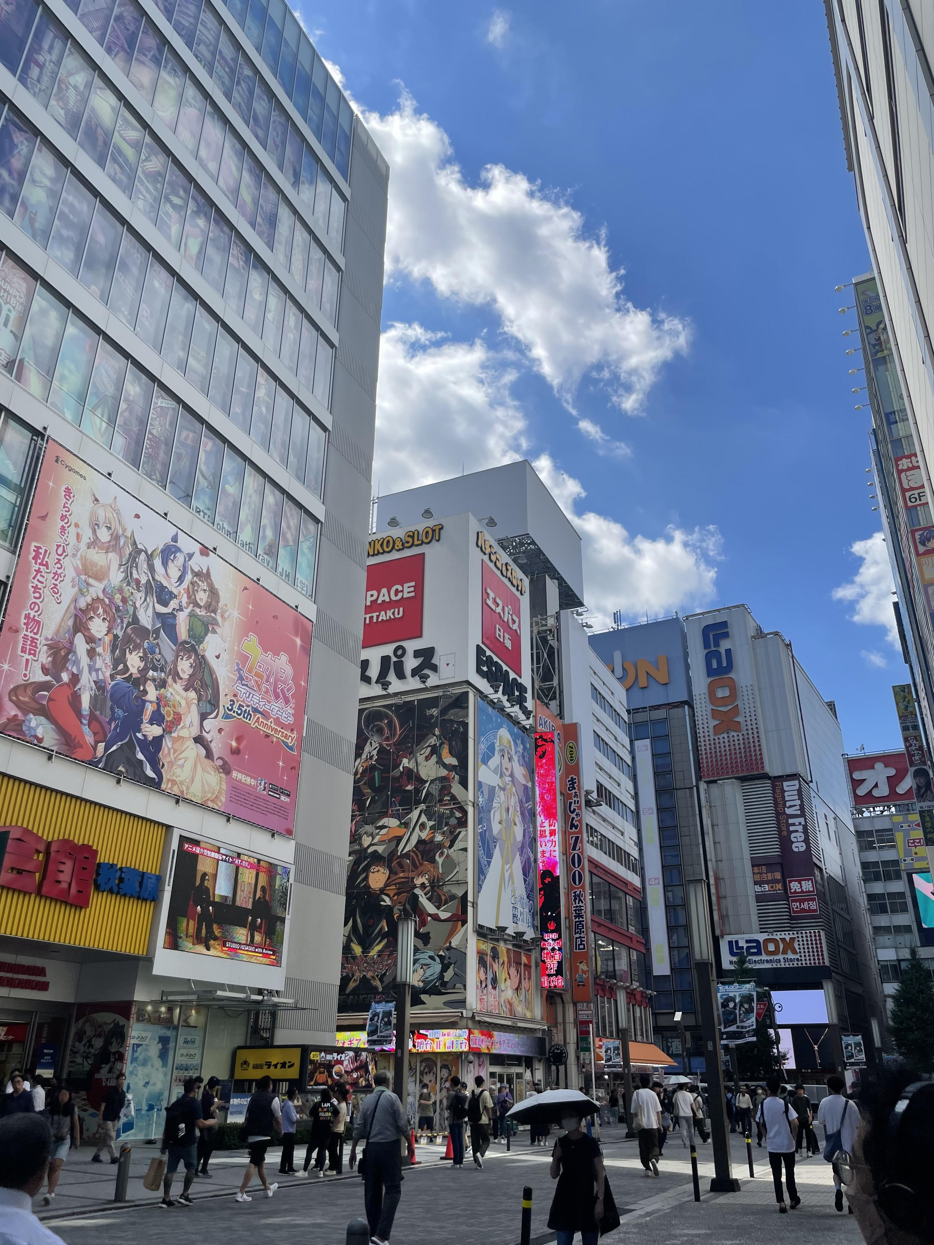 덥지만 맑은 하늘 시원하게 펼쳐진 건물과 알록달록 애니메이션 간판들